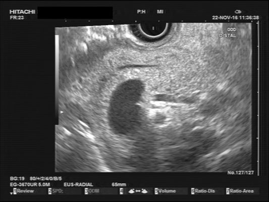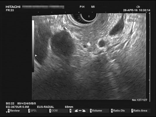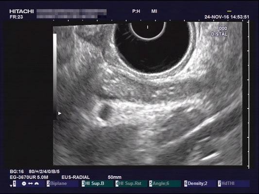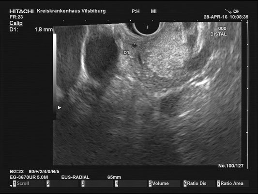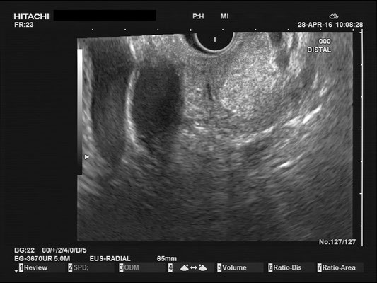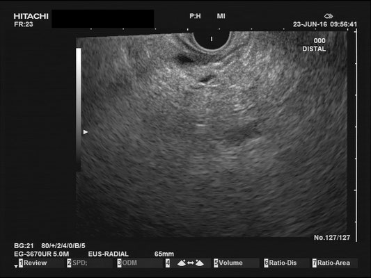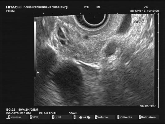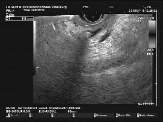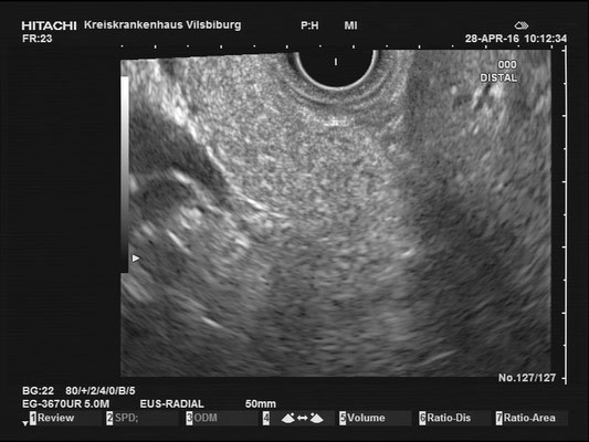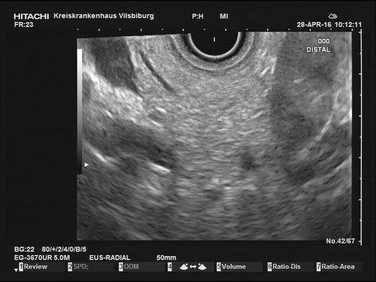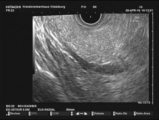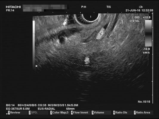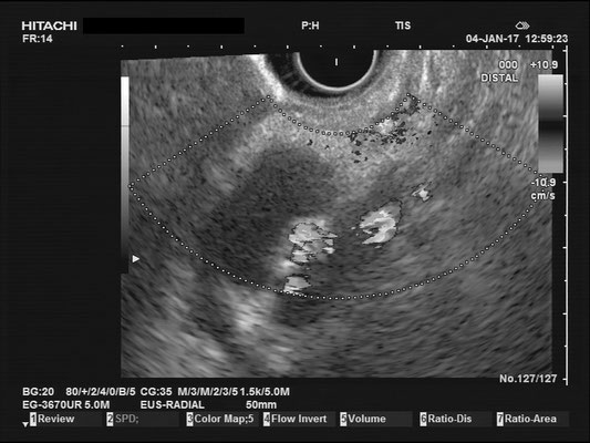 The images above depict a thorough inspection of the pancreas, as seen in an radial EUS Examination. We begin (hopefully ;) bei identifying the uncinate process between the golden V, which is formed by the aorta/V. cava and the mesenteric vessels. After spotting die usually hypoechoic ventral pancreatic root, the duodenal papilla can be identified (for a more detailed approach, please visit "Learning Endosono"). By following the splenic vein, the body and tail of the pancreas can be examined.